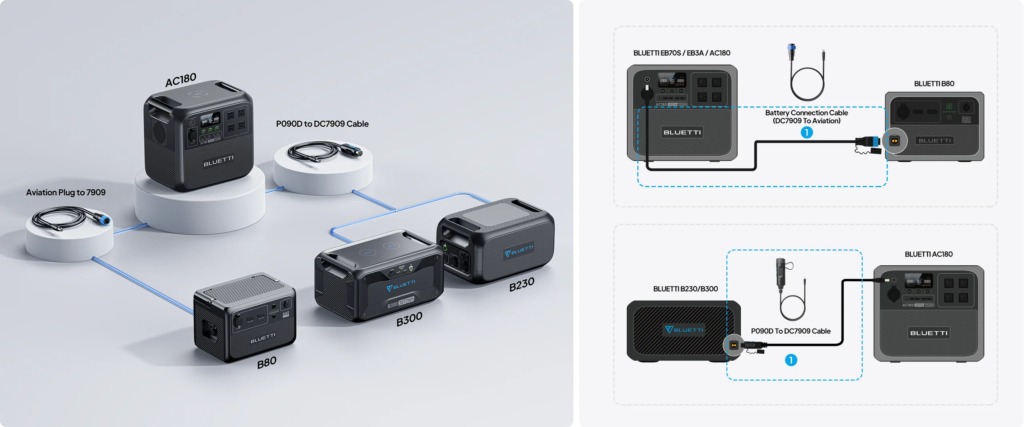 一方、BLUETTI AC180 は、別売りのB80拡張バッテリー(806Wh)に対応しています。