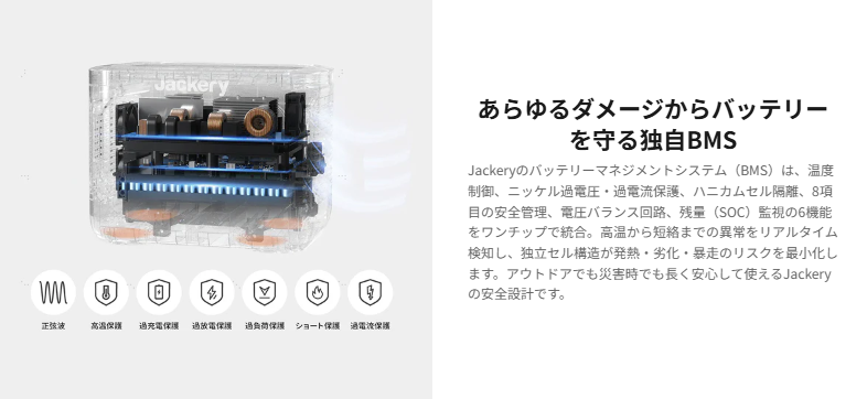 Jackeryは、こうした機能を持つ高性能なBMSを搭載することで、バッテリーの異常を即座に検知・制御し、事故を未然に防ぐ設計になっています。